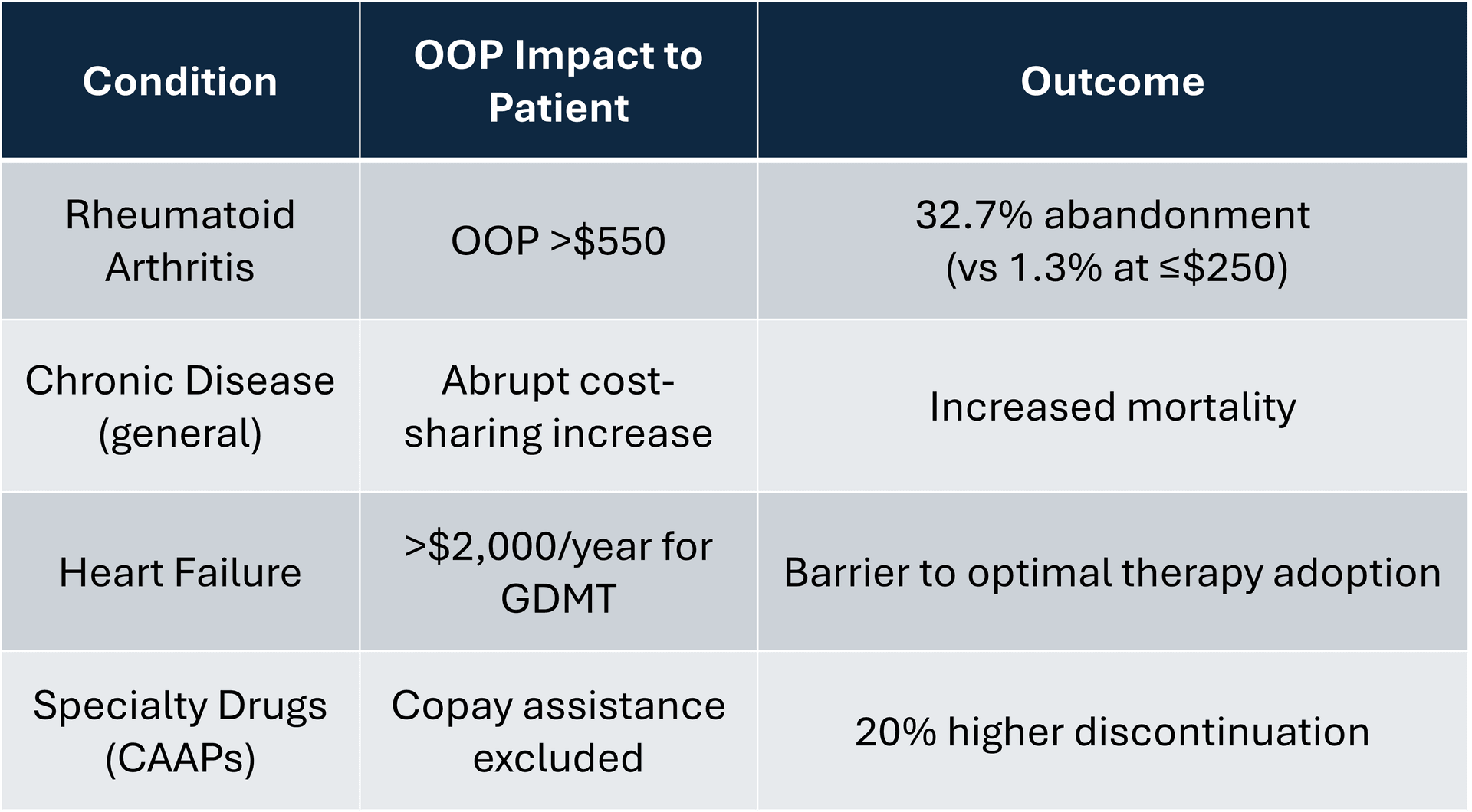 The RA findings align with broader research on cost sharing and health outcomes. A National Bureau of Economic Research study examining abrupt increases in cost sharing found that higher OOP exposure reduced medication use and increased mortality, even for high-value therapies.¹¹