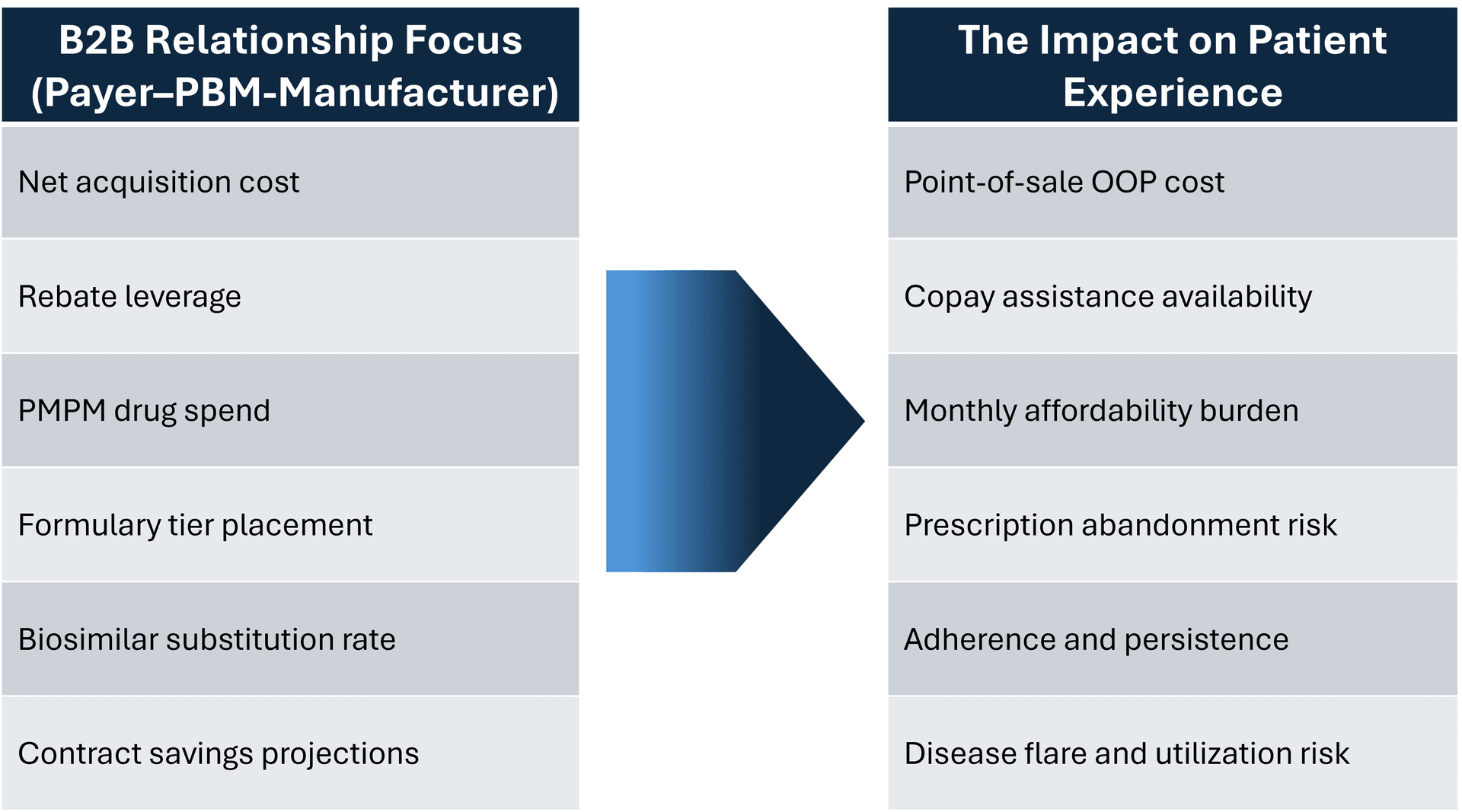 The table below illustrates that misalignment. On one side is the B2B focus driving contracting decisions. On the other is the patient-facing reality that determines whether therapy is taken consistently enough to deliver value.