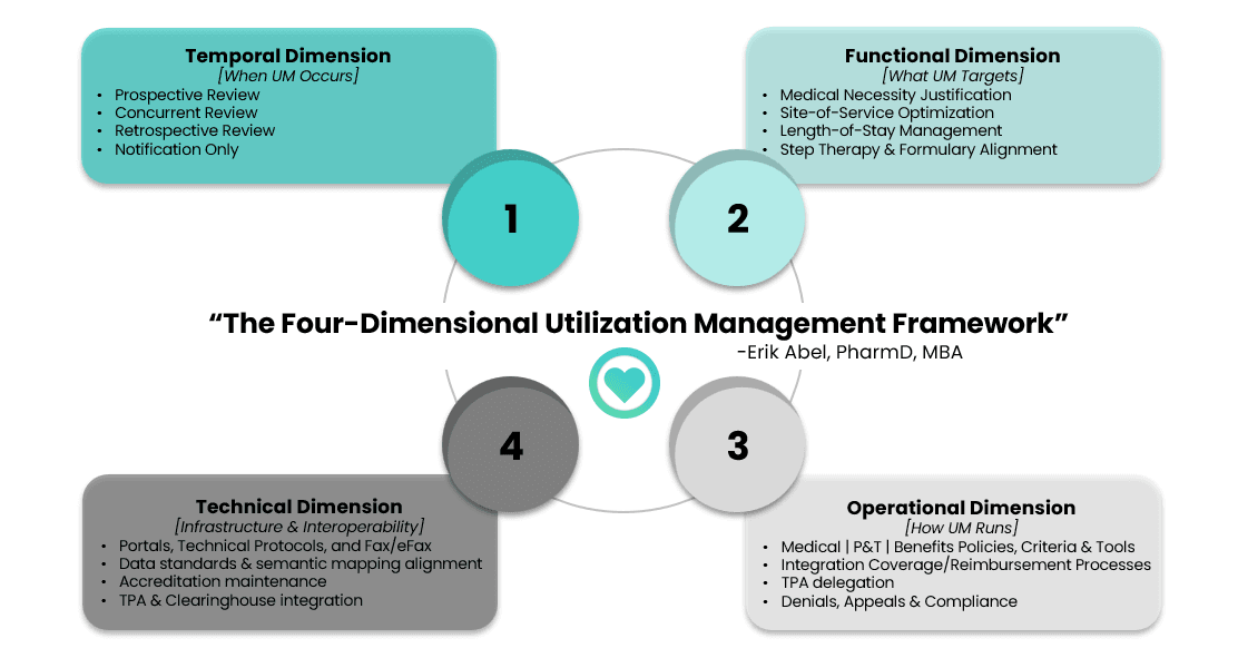 UM is a clinical and administrative umbrella for activities that assess the appropriateness, cost, and timing of healthcare services. While most commentary centers on prior authorization, but PA or ePA (electronic Prior Auth) are just one piece. UM spans medical and pharmacy benefits and coverage where complexity is most easily described using a Four-Dimensional UM Model.