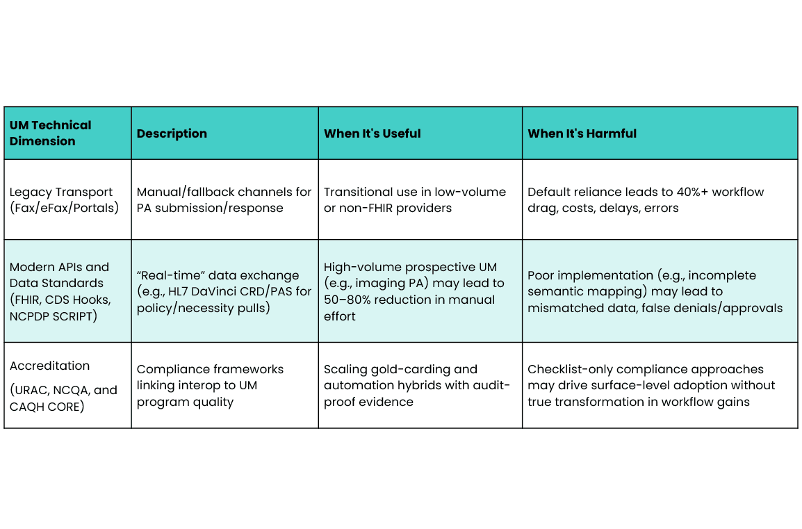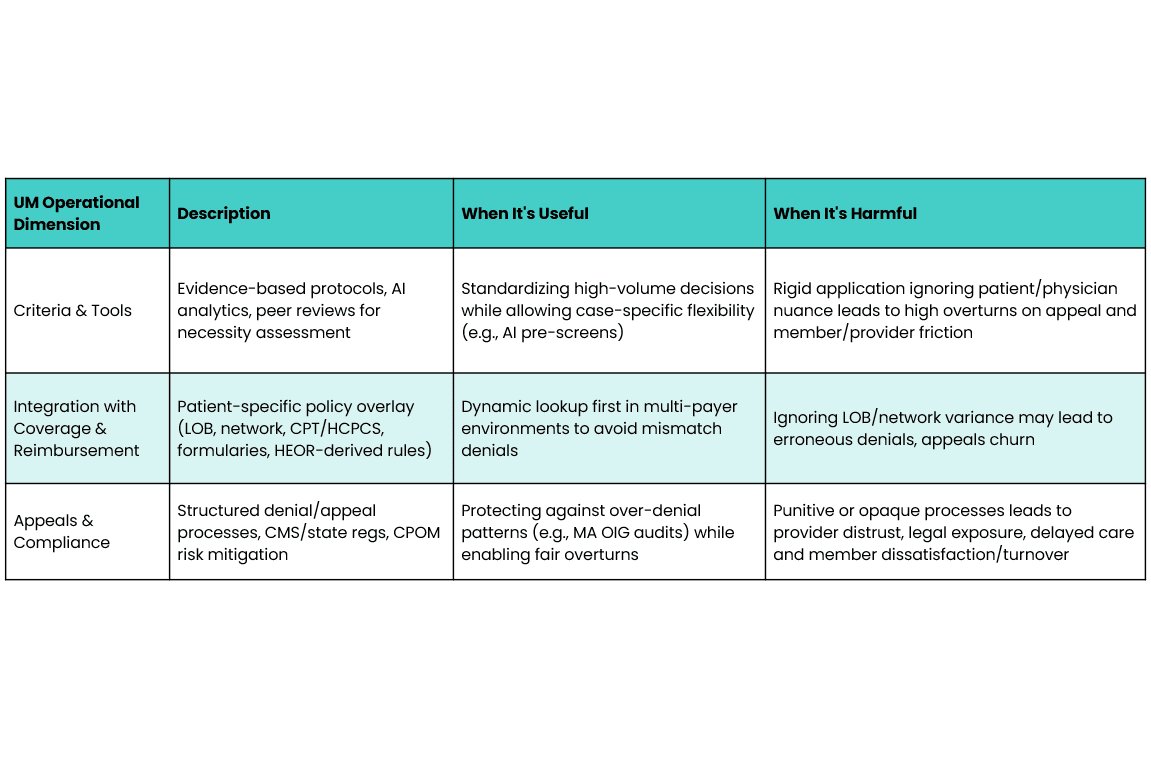 This dimension layers in the mechanics of implementation, from criteria application and appeals to benefit integration and policy overlays. It’s where payer rules, benefit design, and provider workflows intersect with high impact on compliance, denials, and member experience. I cannot overemphasize the communication demand required operationally with UM where health plans are held to regulatory standards that can vary across lines of business - some being state regulated while others are federally regulated with significate nuance. This remains a significant area of opportunity.