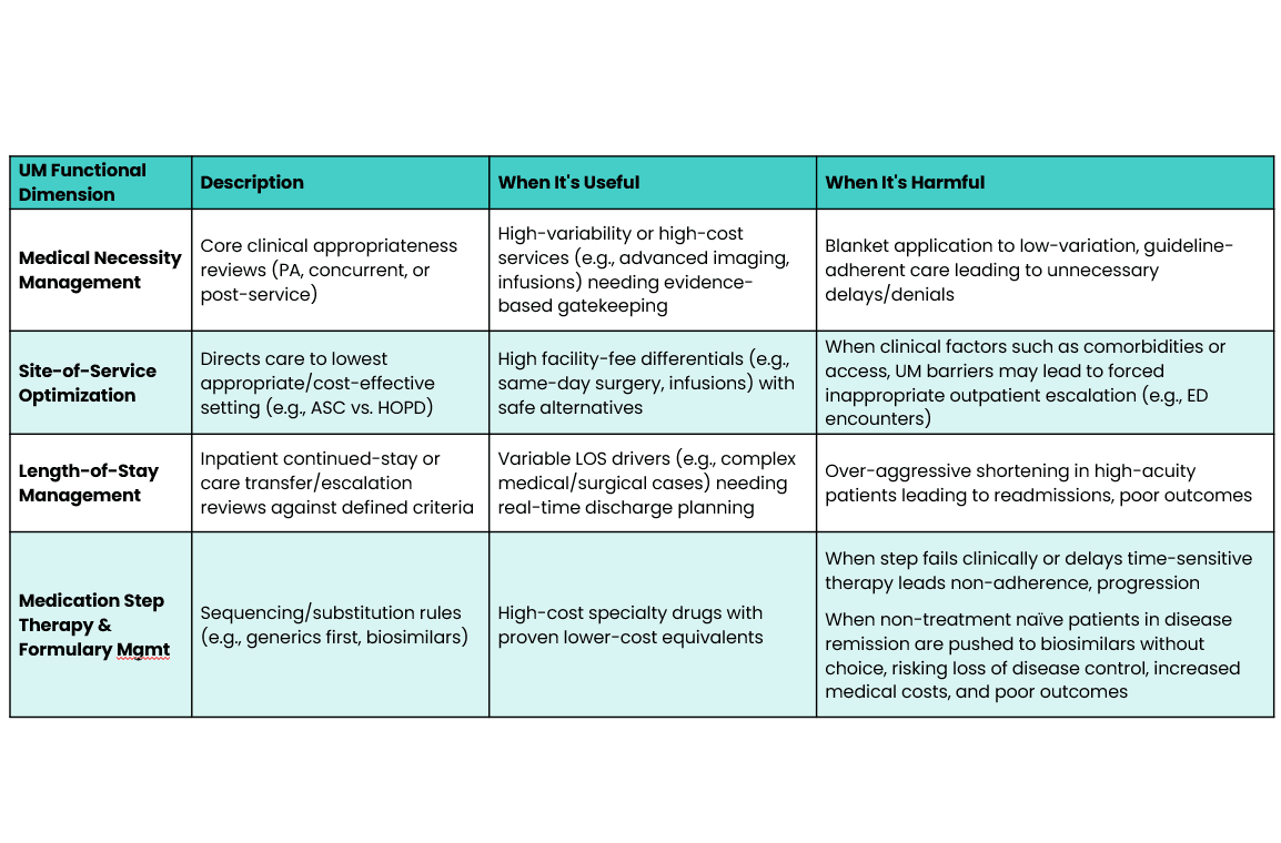 These harms may not be intentional, but they are embedded in the reality of how UM has evolved. UM was originally introduced to reduce unnecessary utilization and rein in skyrocketing healthcare costs. As care delivery evolved and evidence-based medicine matured, UM promised to ensure that interventions were medically necessary, evidence-based, and aligned with the benefit design of each plan.